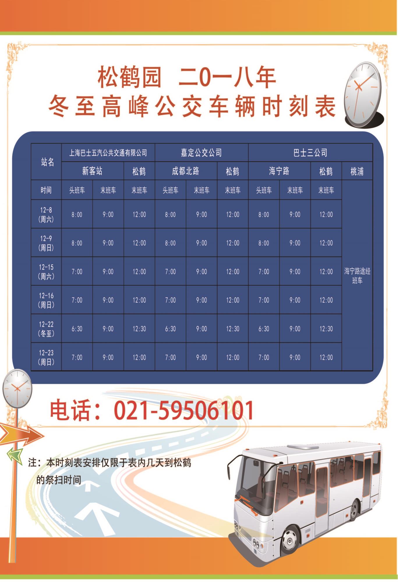2018年冬至即将来临,市区前来松鹤园祭扫的客户量急增,为方便市区客户来我园祭扫,松鹤园与上海巴士汽车公司沟通后,特此增加市区往返松鹤园的班车数量和班次。市民如需乘坐班车,请提前联系市区办事处。联系电话:新客站办事处52716459、人民广场(成都北路)办事处62675279、海宁路办事处63545588、桃浦办事处66268962。